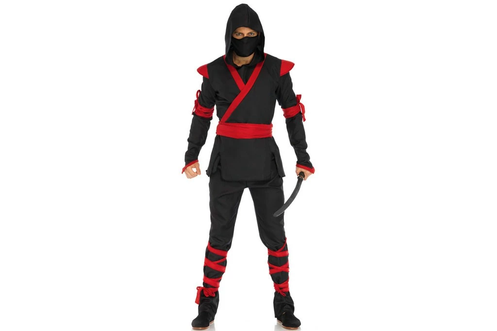 5 delig Ninja killer kostuum, bestaande uit een jack met capuchon met wikkelbanden, bijpassende broek, riem en gezichtsmasker.